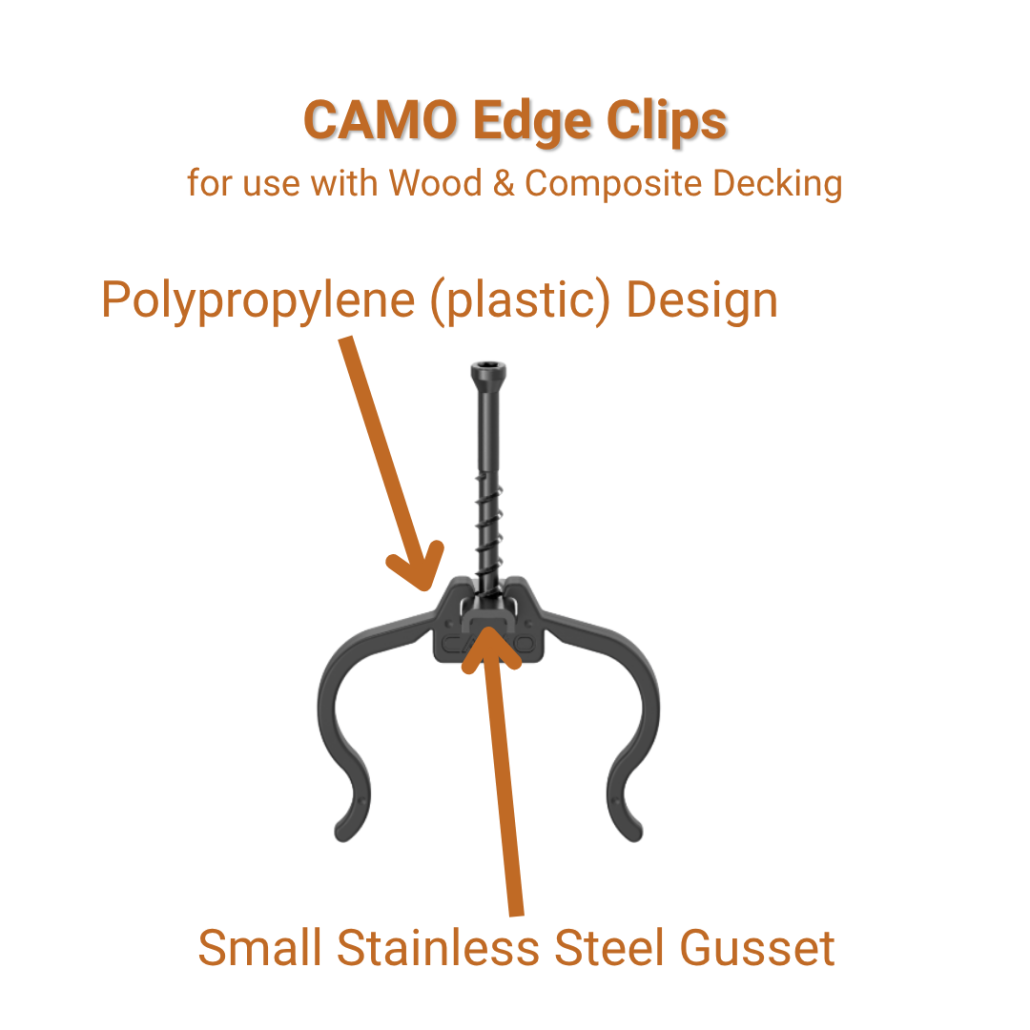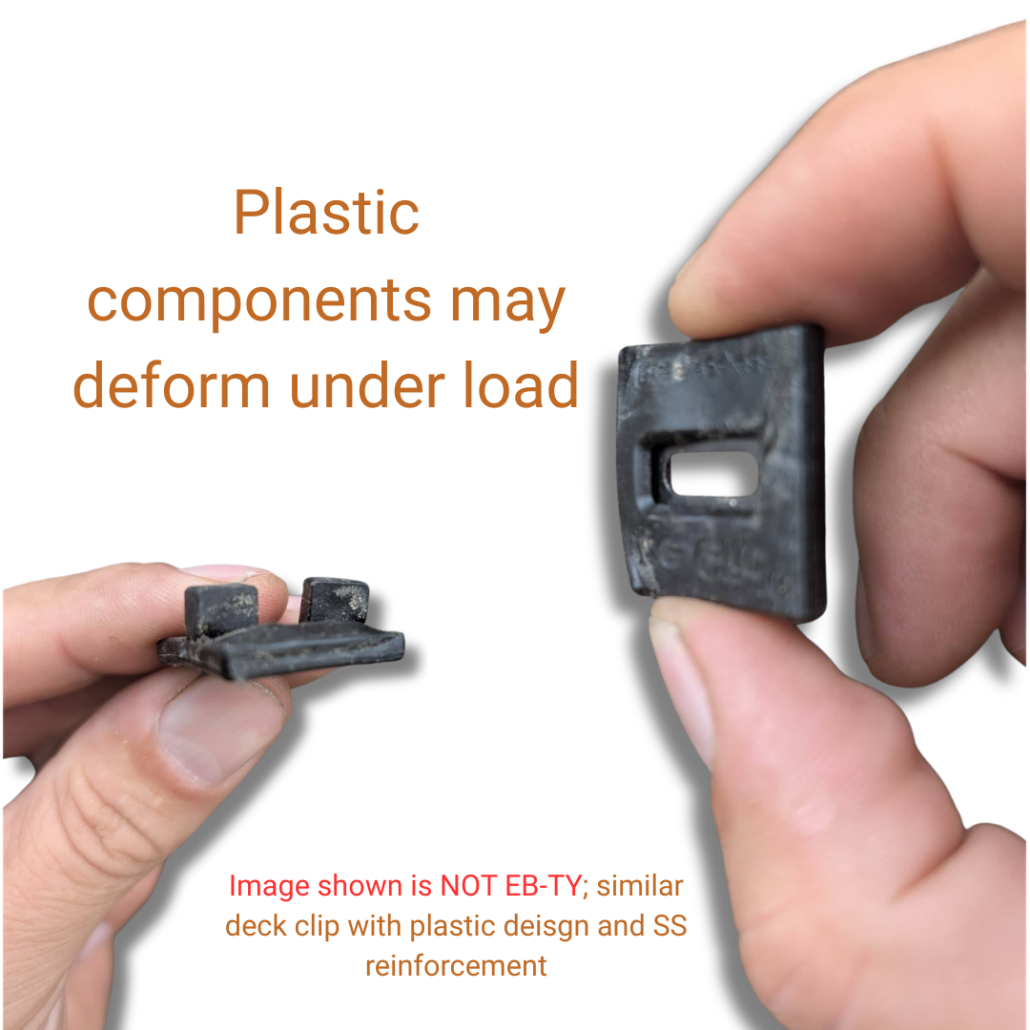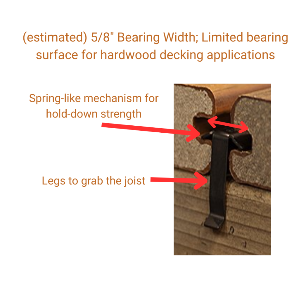 - Material — The strength and durability of the clip itself. Hardwood decking creates significantly more stress on fasteners than composite. Materials like coated aluminum or stainless steel tend to perform better than plastic-based systems over time.