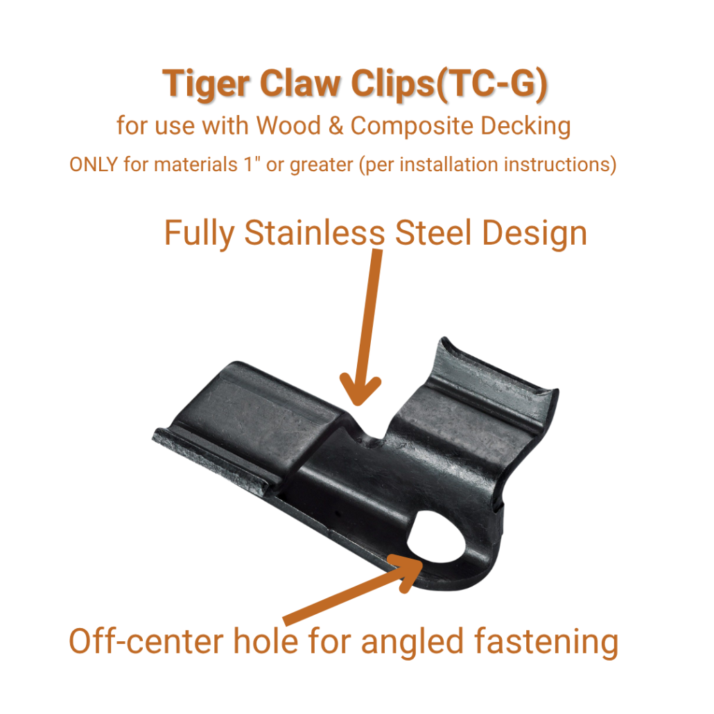 The Tiger Claw TC-120 system is a folded stainless steel clip that relies on a spring-like mechanism to hold decking boards in place. It is commonly used across multiple decking types and can be paired with the TC-150 clip for butt joints. While it performs adequately in some areas, its design raises concerns when applied to dense hardwood decking.