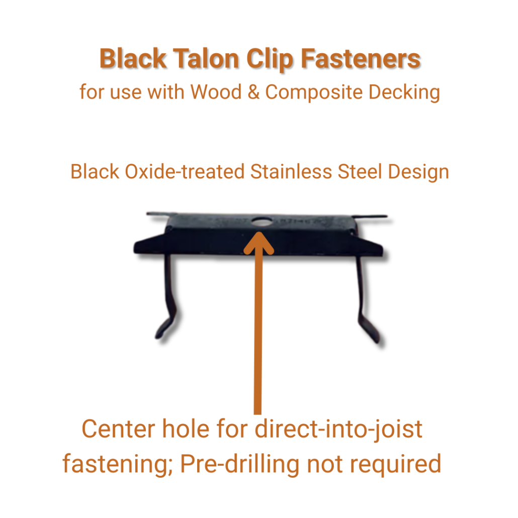 The Black Talon hidden deck clip system is a stainless steel fastening system designed for grooved decking. It uses a straight-down fastening method and a spring-style clip design to hold boards in place while allowing for movement. Positioned as a universal solution for both wood and composite decking, it emphasizes ease of installation and serviceability, though there are tradeoffs when applied to dense hardwoods.