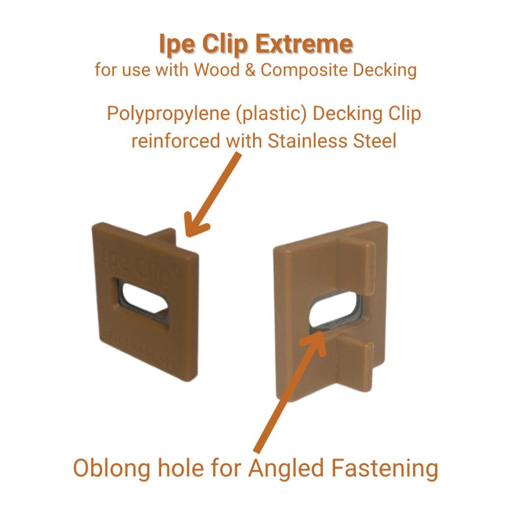 The Ipe Clip Extreme system is one of the more established hidden fastener options in the hardwood space. It uses a plastic body with stainless steel reinforcement and is available in two spacing variations. While it offers a more packaged system, there are still tradeoffs in installation complexity, board replacement, and overall long-term flexibility.