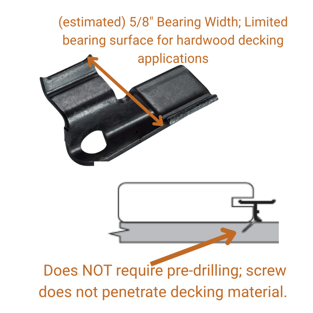- Clip Bearing Width — The amount of surface area holding the board down. A wider bearing surface helps distribute load, reduce movement, and improve long-term stability—especially important with dense hardwoods.