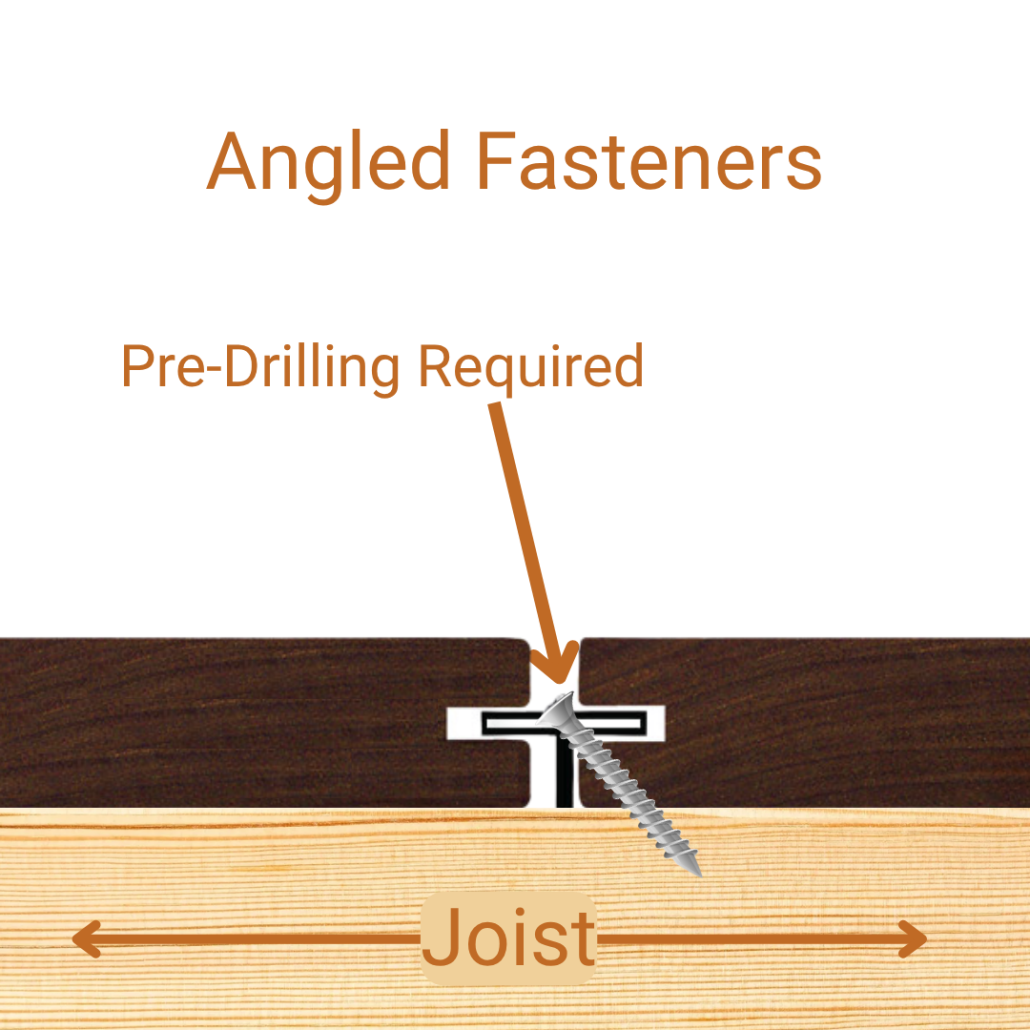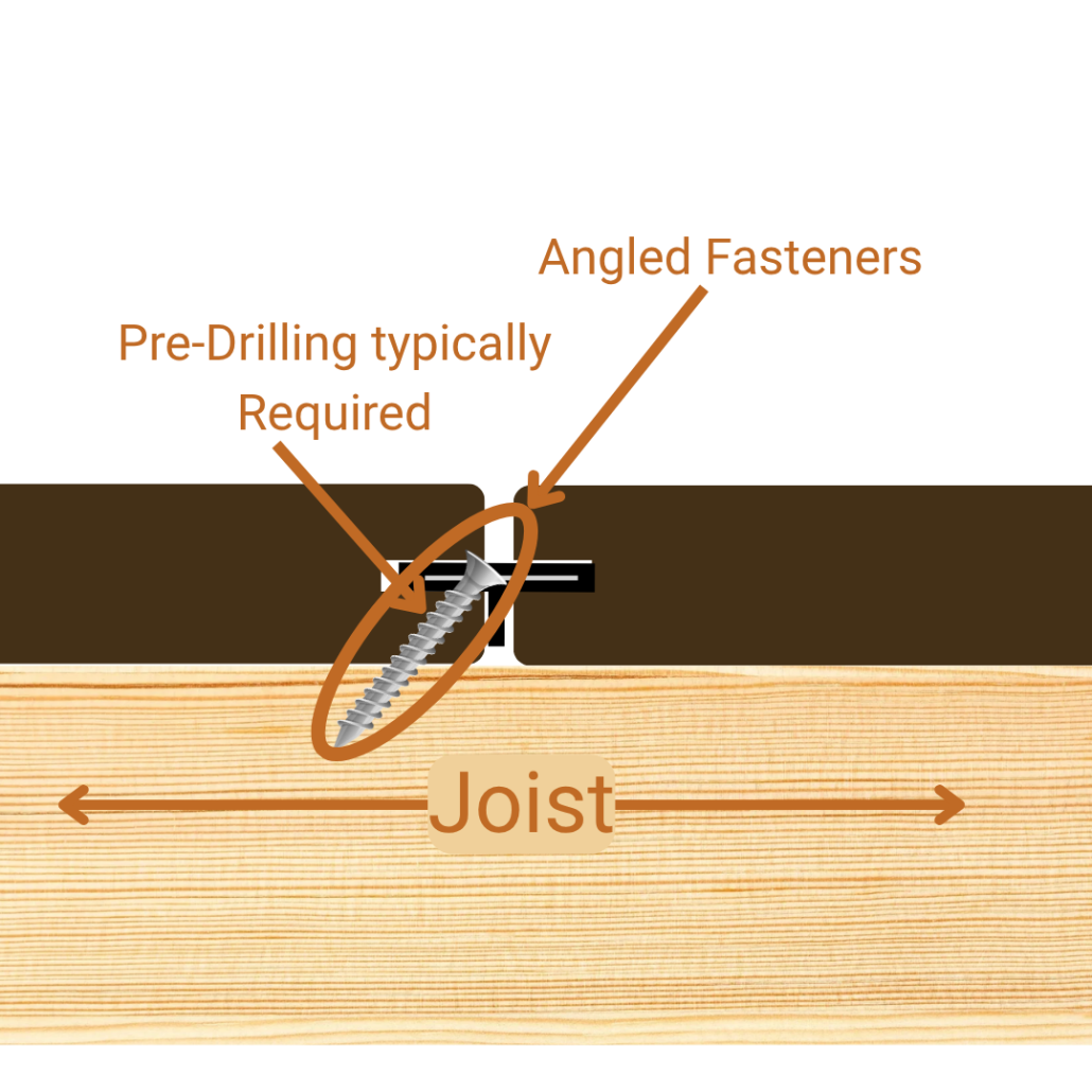 - Fasteners are driven at an angle and positioned near the joist edge, making installation less intuitive than straight-down systems.