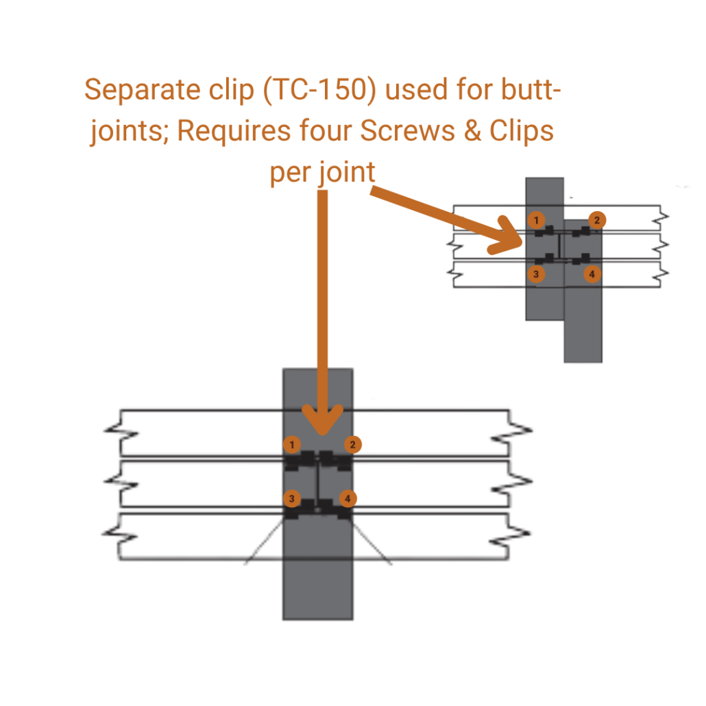 | Butt Joint Solution (Single Joist) | Yes — double-width clips included in each package for butt joints or full-deck use | No — no dedicated butt-joint solution on a single joist | No — no dedicated butt-joint solution on a single joist | Not specifically defined (biscuit-style connection may allow it) | Yes — requires TC-150 clips (typically four clips per butt joint) | Not specified (clip length may allow it, but no defined system guidance) |