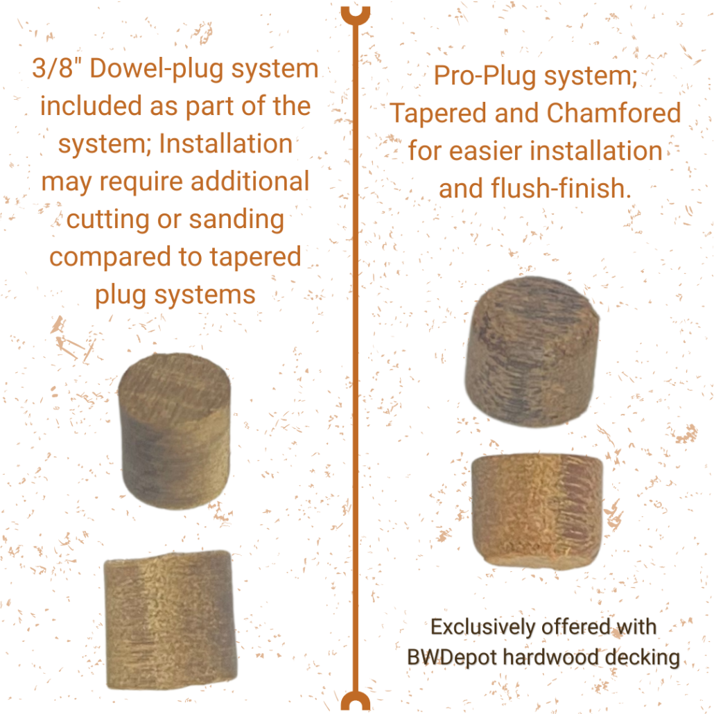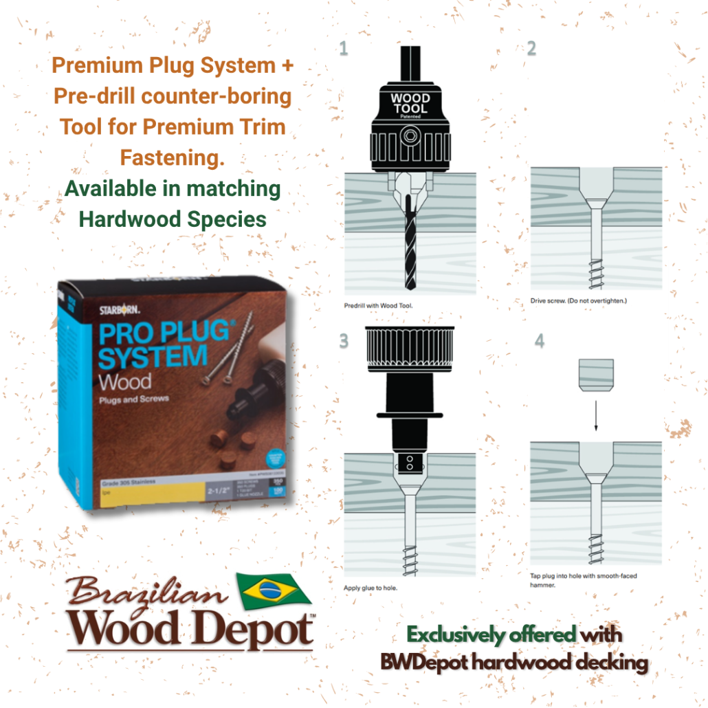 | Integrated Trim System | Yes — Pro Plug System (sold separately) or GRK stainless steel trim screws recommended | Yes — 3/8″ plug system (requires separate Forstner bit; multi-step process) | No integrated trim or plug system offered | Yes — dowel plug system (reciprocating saw method) | No integrated system (surface screws or deck screws recommended) | Not addressed (likely requires surface fastening at perimeter) |